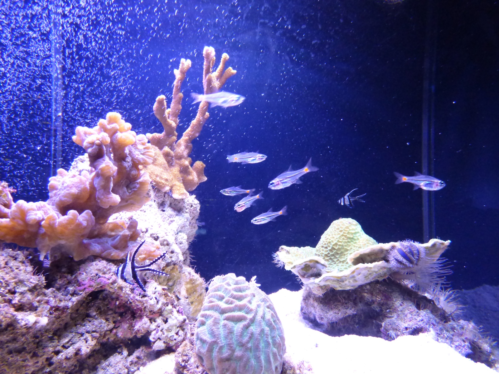 Monaco | Oct 2023 Click here for Thumbnail View More aquarium Image 42 of 76 White and black stripey fish is the Banggai Cardinal Fish (Poisson-Cardinal de Banggai), and the other one is a Okinawa Goby (or in French "Gobie Coail Jaune")